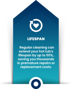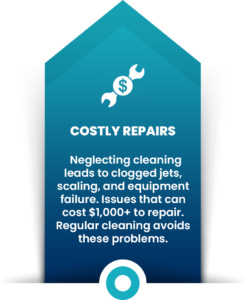 Regular cleanings prevent buildup that can damage plumbing, jets, and heaters.